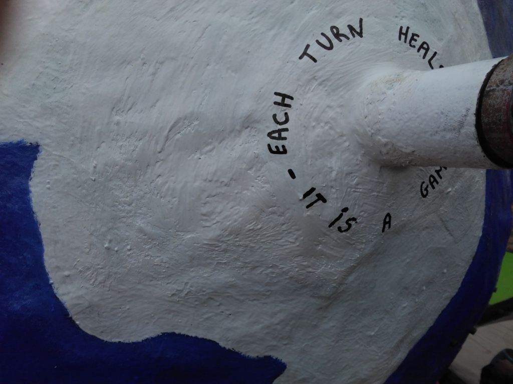 The end of the construction was the beginning of the work of Gaïa itself. It is as if Gaïa was a spirit guiding the whole project, finding its way among the people and taking form in the material world. We wrote the two phrases Txema and I had selected: “Each turn heals – It is a game” on the South pole.